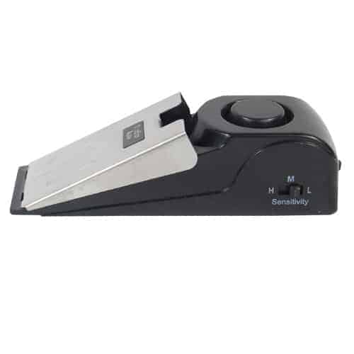 Use the SUPER DOOR STOP ALARM as an entry alarm and to block a door from being opened. If anyone tries to open the door, this 120dB alarm will sound. Alarm stops when pressure is released from door stop plate. There is also a movement sensor with adjustable sensitivity that will activate the alarm if it?s tampered with. On/off switch is on the back of the alarm and includes a low battery indicator light. Uses one 9-volt battery (not included).